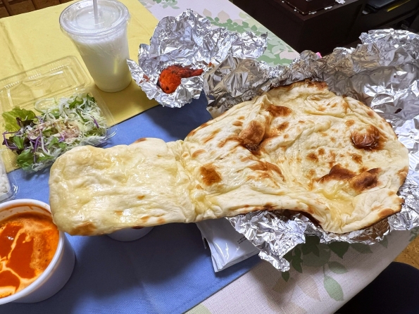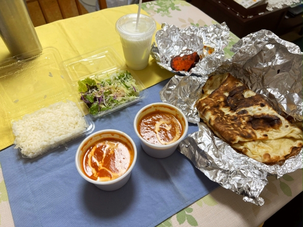 ■今日は小忙しかったので、ロケットナウで近所のカレー屋にカレー2種、ナン、ライス、チキンティッカ、サラダ、ラッシーがセットになった大盛定食メニューを発注。クーポンを使って350円。