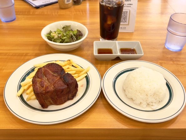 ■早朝からの作業帰りに、マロリーポークステーキ チネチッタ店でランチのロッキーセット。1500円。
