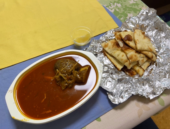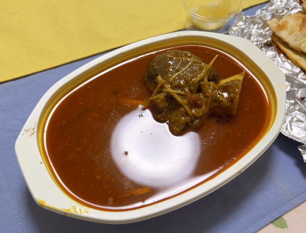 煮込みまくったマトンスープカレー的なブツ。サラサラでオイリーな汁の中に骨付きマトンがゴロッと。骨から肉を剥がし、骨の周りに残ったブツも綺麗に囓り取る。