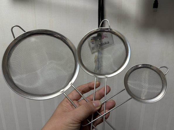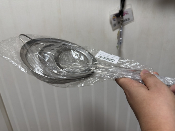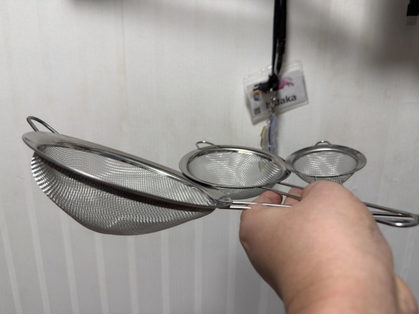 持ち手付きザル。もう少し大きいかと思ったが、まあいいでしょ。一番大きいやつは一人前の麺の湯切りに。小さいやつは粉振りの時なんかに使います。