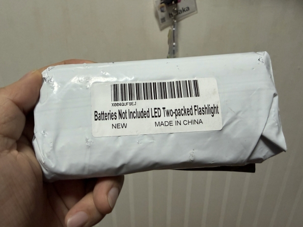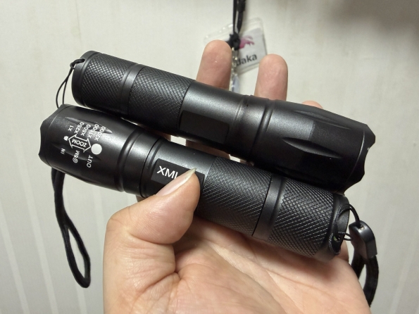 懐中電灯2個セット。よくある形でよくある機構。家にあった単四電池3個を入れたら無事点灯。