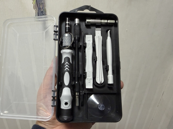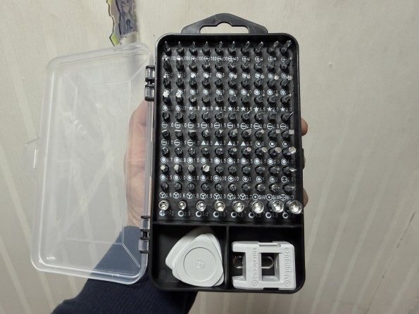 ドライバーセット。厚めの箱の裏表に蓋があって、表にはドライバーの柄や機械の隙間に捩じ込み開けるための棒状工具が、裏にはドライバービットが収納されている。