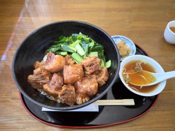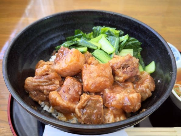 甘辛の柔らか牛バラ肉と油通しされた青菜が乗った丼。ザーサイ漬物と中華スープ付き。通常850円のところ、+150円で大盛りにしてもらった。
