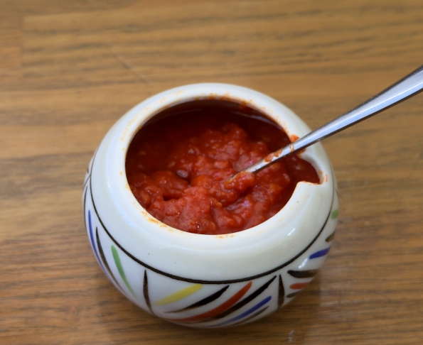 基本は肉と青菜を混ぜ、ご飯と共に掻っ込む感じの丼メシなんですが、僕はここに卓上調味料の辛味噌を乗せます。