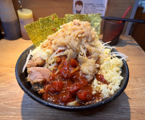 まずはライスに卓上のふりかけ、おろしニンニク、豆板醤を乗せ、ラーメンスープを掛ける。しっとり濃い味になったライスを海苔で巻いてパクり。ザ・ジャンク。