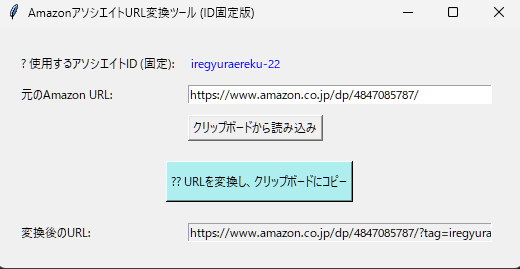 例えばこれは、「Amazonの商品URLをクリップボードにコピーしたら、一発で自分のアソシエイトIDを付けられる」というプログラムをEXEファイルにし、ダブルクリックでGUI起動して貰うように頼んだ物。正味、手間なだけだから使い道は無い。