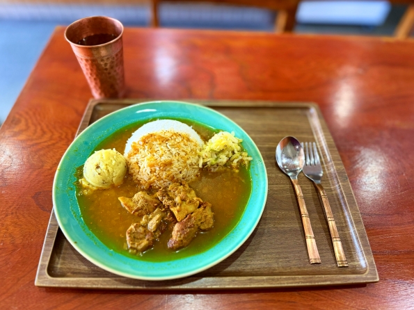 キャベツアチャールとマッシュポテトが添えられたチキンカレー。スパイスが利いた本格的なお味だけど、カレー本体は少々薄味。鶏肉を崩し、添え物と共に全部混ぜ込んで一緒に食べた方が、味が濃くなって美味しいですね。
